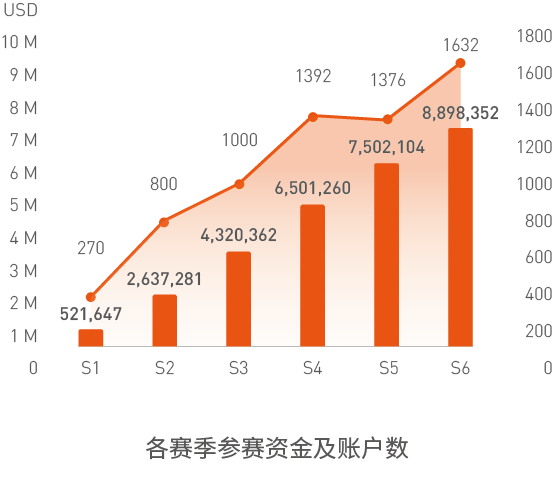 ImTrader 交易大赛发展至今,早已褪去当年青涩的模样。自举办以来,参赛账户、参赛资金及传播影响力都获得质的飞跃,从 S1 赛季到 S6 赛季,参赛账户数从270个到 1,632 个,参赛资金从 521,647 美元突破到 8,898,352 美元,传播影响力从最初的10万次到 1,000 万次。ImTrader 交易大赛在激烈的市场中突围而出,逐步规模化和专业化,在行业中占据一席之地。