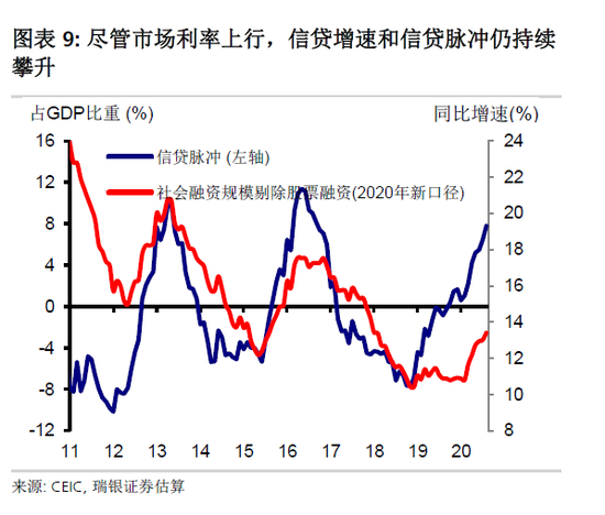 以上指标表明,尽管流动性宽松始于2018年年中,并伴随市场利率下降,但直到2018年底,信贷增速和信贷脉冲才触底,而且直至2020年两者才出现明显反弹。同样地,虽然市场利率在过去5个月不断攀升,但整体信贷增长仍在加速。瑞银预计信贷增速和信贷脉冲最早或将在10月或11月触顶。