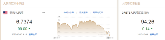 10月15日,人民币中间价报6.7374,上调99点,上一交易日中间价报6.7473,在岸人民币上一交易日收报6.7370。