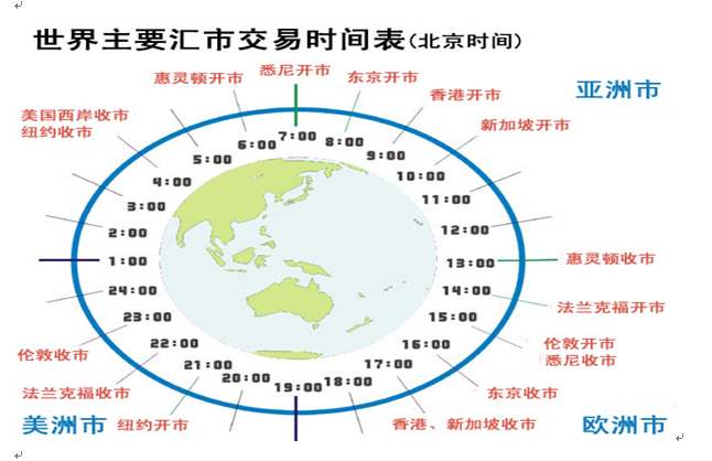 外汇市场一天的交易时间,随着地球的运转,先从悉尼开始,然后到东京、香港,接着是法兰克福、伦敦,至纽约为一天的结束。外汇市场跟其他金融市场不同,投资者可以随时随地对世界经济、社会民生、自然天气及政治转变所带来的影响作出反映,是一个全天候24小时都可以进行交易的市场。
