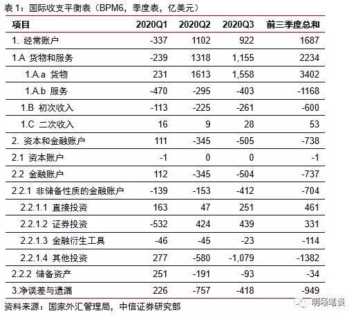 外汇从哪来:外贸顺差大,海外机构投资境内证券也较为踊跃。研究外汇占款的流动首先要了解我国国际收支的总体情况。我们列示了简化的国际收支平衡表(BPM6):①国家外汇管理局会按季度公布当季的国际收支流量变化,表中列示的数额均为“贷方-借方”的轧差值;②简单地说,凡是引起我国外汇收入增加的项目变化都会被计入贷方(例如出口走强就会带来收支平衡表贷方的增加,境外金融机构投资我国证券也会带来贷方余额的增加),凡是引起我国外汇支出增加的项目变化都会被计入借方(例如银行将外汇存放于他国央行或银行将增大BPM6的借方,商业银行向境外机构投放贷款也会增大BPM6的借方);③从2020年前三季度的国际收支平衡表来看,经常账户流入1687美元外汇(贸易顺差多增),资本与金融账户中直接投资、证券投资项共流入792亿美元。