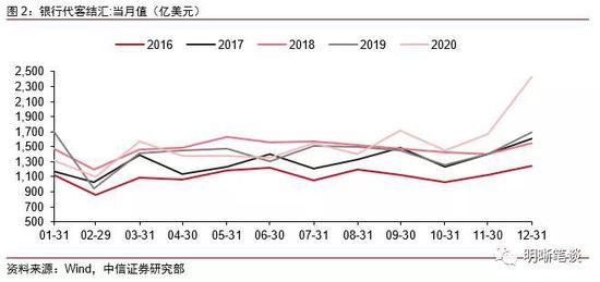 从结售汇的季节性角度来看,通常春节前或迎来企业结汇需求的增加,去年12月份银行代客结汇规模的上涨尤为明显,净结汇规模达到2014年1月以来的最高水平。对于银行代客结售汇业务而言,由于在春节前较多外贸企业会面临支付员工薪酬和奖金的问题,这催生了企业结汇的需求,企业结汇意愿也相对较强,因此企业结汇具有一定的季节性特征。从2016年以来的银行代客结汇数据上我们可以看到,通常在当年12月份与次年1月份银行代客结汇金额会出现明显上涨。从去年的情况来看,2020年12月份银行代客结汇规模为2427.19亿美元,明显高于往年同期,而从代客净结汇的角度来看,去年12月份银行代客净结汇规模为652.19亿美元,更是达到了2014年1月以来的最高水平。