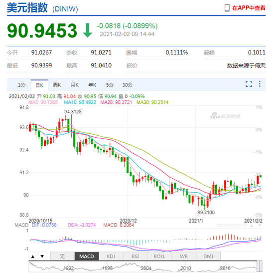2月2日,美元指数逼近91关口,人民币中间价报6.4736,下调113点,上一交易日中间价报6.4623,在岸人民币上一交易日收报6.4641。