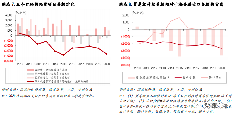 前述三套数据统计口径的差异,导致三者的结果不同甚至方向相反。如2014年以来,国际收支口径的经常项目持续顺差,但涉外收付口径的经常项目却持续逆差(2020年前三季度,分别为顺差1687亿和逆差371亿美元)(见图表7)。这主要反映了出口少收、进口多付导致的贸易顺差不顺收。按照权责发生制,企业只要在海关出口报关就纳入国际收支统计,但按照现金收付制,出口未收款则不纳入涉外收付款统计。2020年,海关可比口径的贸易收付款顺差小于海关进出口顺差3634亿美元,其中出口少收款贡献了73.2%(见图表8)。