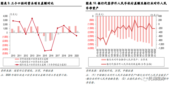 对于资本项目,银行结售汇与涉外收付款由于统计口径不同,其反映的结果也有所不同。如2020年涉外收付口径的资本项目顺差1631亿美元,结售汇口径的资本项目净结汇仅有435亿美元(见图表9)。其中一个重要原因是,资本项下如陆股通和债券通北上资金是以人民币形式流入,这在结售汇统计中并不涉及。