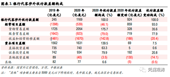 动态地看,2020年银行代客涉外收付顺差较上年增加924亿美元,经常项目净流出减少贡献了93.0%,其中货物贸易净流入增加、服务贸易净流出减少分别贡献了35.6%和77.9%;资本项目净流入增加贡献了7.5%,其中直接投资净流入增加仅贡献了0.6%,证券投资净流入增加贡献了20.8%,而由于其他投资收付款由顺差转为逆差,后二者合计,热钱净流入增加对涉外收付顺差增长仅贡献了6.7%(见图表3)。