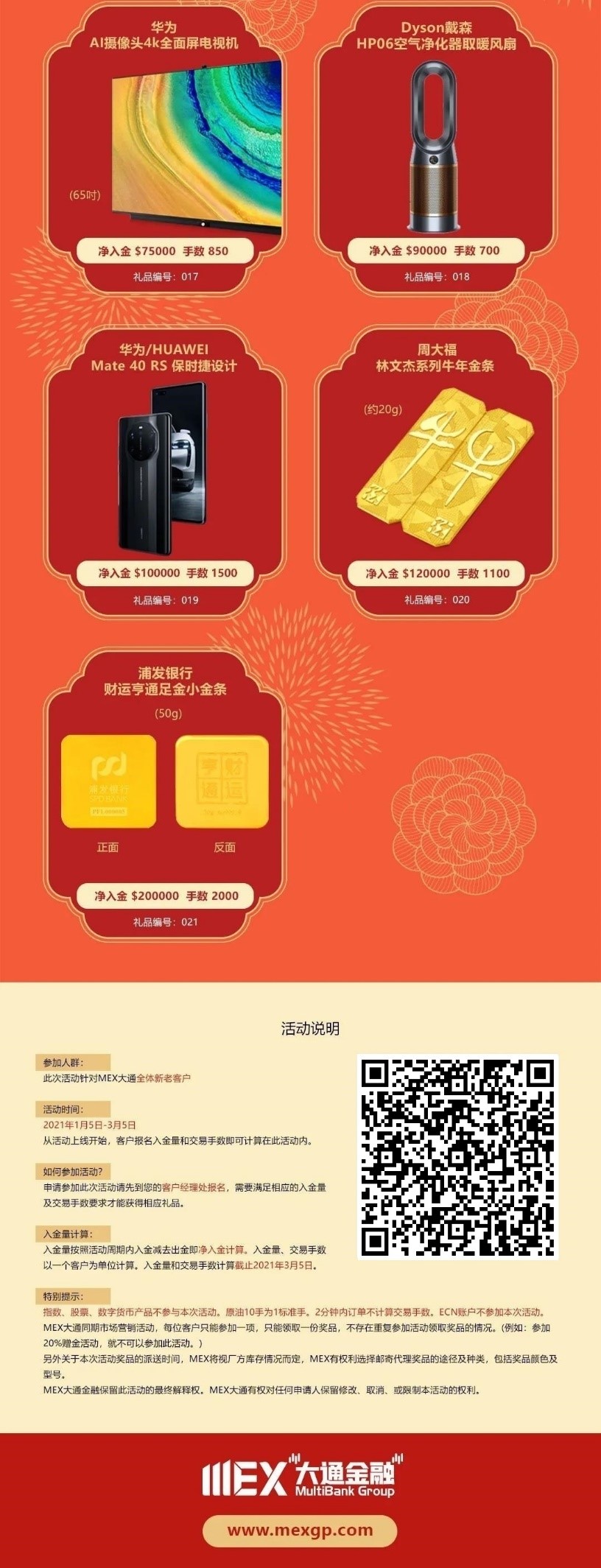 MEX大通“牛年豪礼”活动对所有新老客户开放,今日开启活动后,即可前往客户经理处报名,入金和交易手可以计算在此活动内。