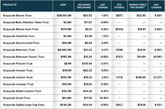 目前,灰度一共推出了包括BTC、ETH、ETC、BCH、FIL、XLM、BAT、LTC、MANA、ZEC、ZEN、LINK、LPT等13支主流数字资产信托基金,还有一支大盘指数基金。其中,灰度比特币信托基金(GBTC)目前已经是世界上最大的比特币基金,该基金持有大约654,421个比特币,市值规模达381亿美元。
