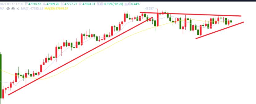 从1小时K线图来看,从43000附近涨到48500附近之后,短期上方在48000附近压力较大,目前成三角形整理形态 ,从趋势来看,上涨势头有些减弱,注意调整风险!