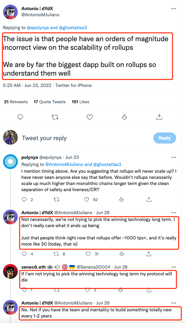 - 夸大的 tps:dYdX 创始人 Antonio 曾“吐槽”目前的 rollups 的 tps 更像是 30,而不是声称的 1000+