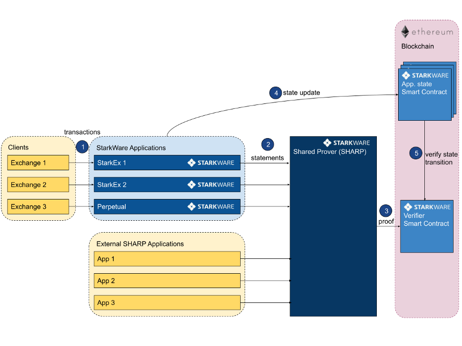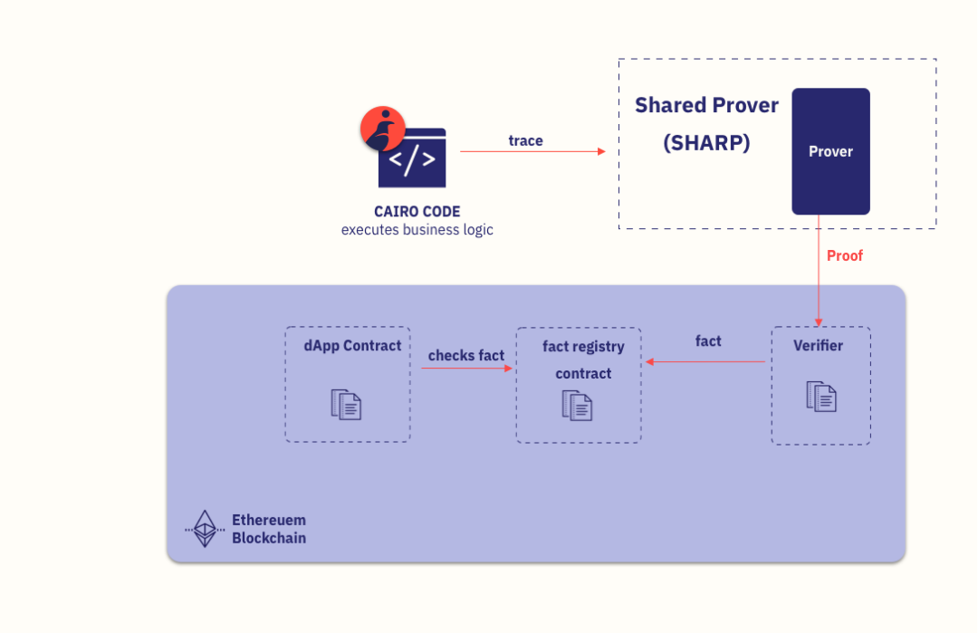 - SHARP —— 共享验证器(shared prover,由 StarkWare 定制)。SHARP 是 Cairo 语言的一个共享证明服务。它接收来自不同 app 的证明请求,并输出证明以证明 Cairo 代码执行的有效性。目前,它将被部署在 StarkWare 的中心化服务器上。