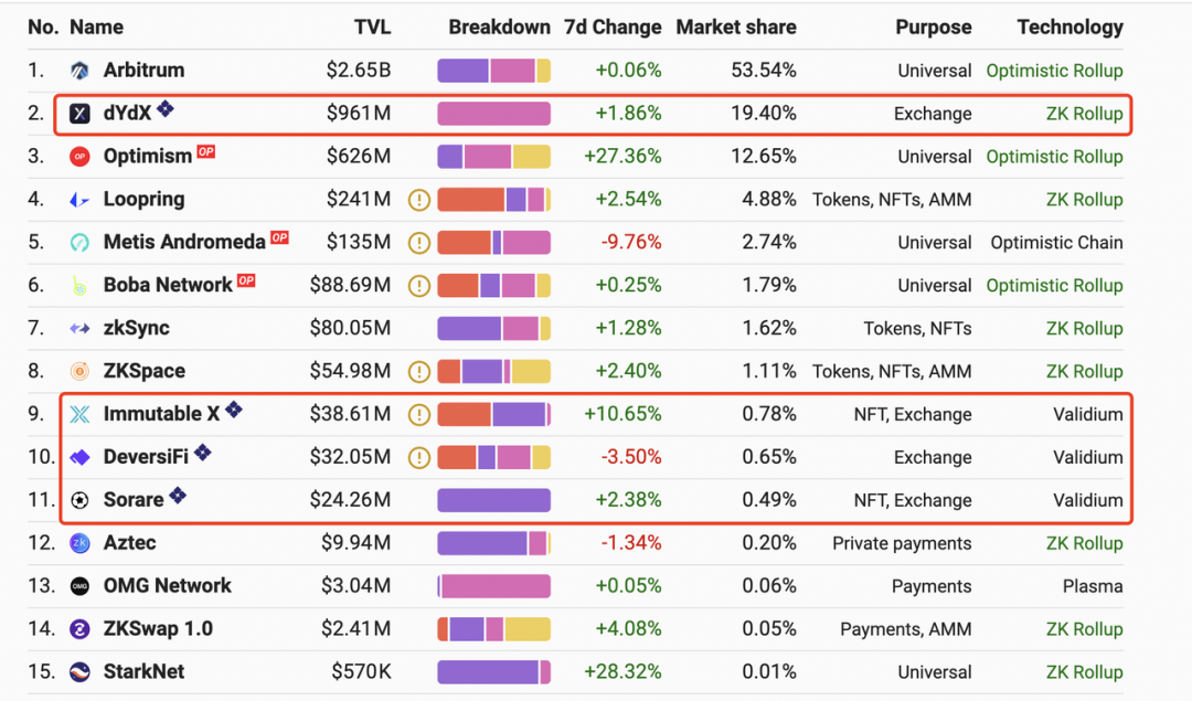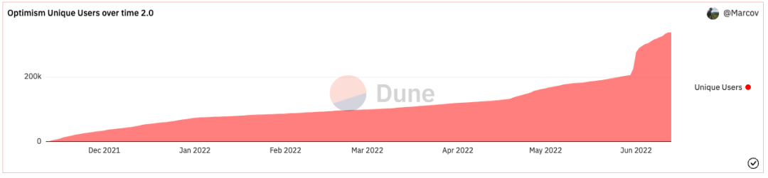 Optimistic rollups 由于技术上比 zk rollups 更容易实现,在市场上更早获得主流应用,也更成熟。该赛道的头部玩家有 Arbitrum 和 Optimism。