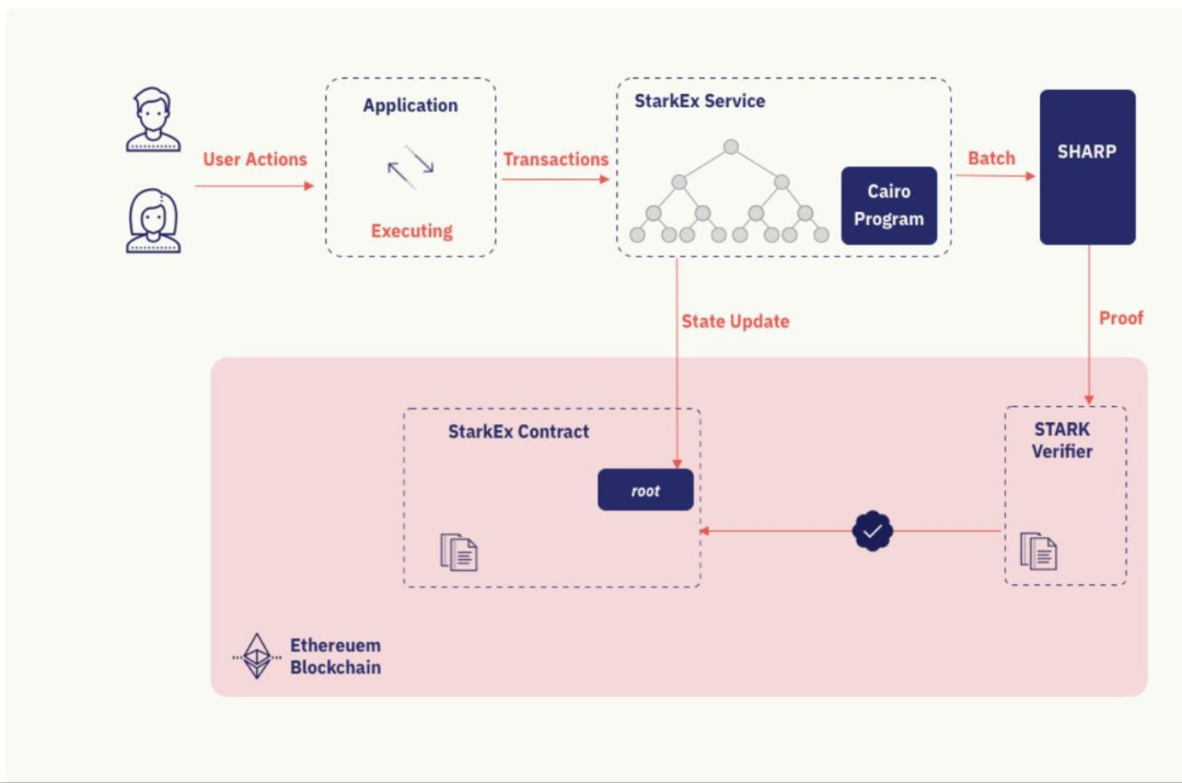 - StarkEx 合约( verifier 合约)是以太坊上的一个智能合约,负责状态更新、存款和提款。