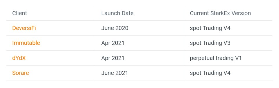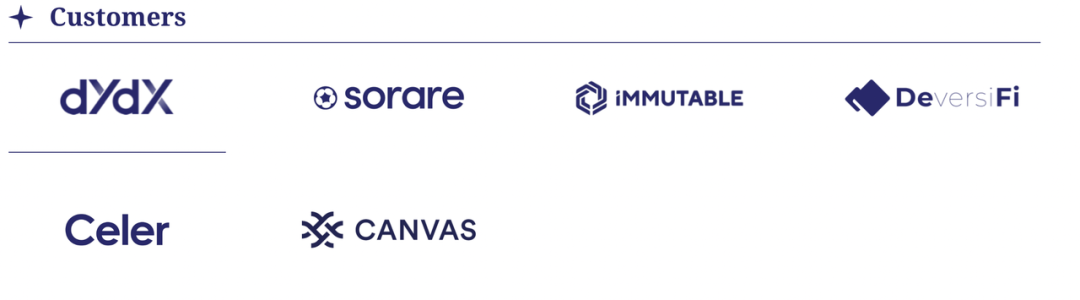 StarkWare 目前的收入主要依赖于 StarkEx 的技术服务,客户的主要需求是,希望保持以太坊级别的安全性,同时减少 gas 成本。官网显示目前有 6 位客户。分为 2 类:
