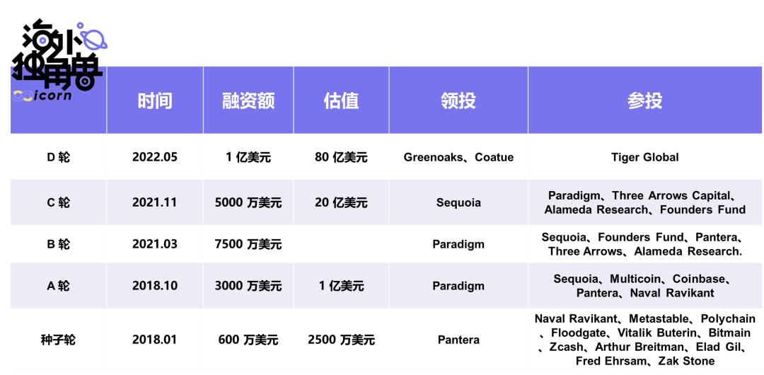 StarkWare 在种子轮受到了 Pantera 以及 Vitalik、Elad Gil、Naval 等知名人士的青睐,并且得到了以太坊基金会 1200 万美元的捐赠。随后的几轮中,Paradigm、Sequoia、Multicoin 等顶级风投加入,其中几家接连多轮重注。