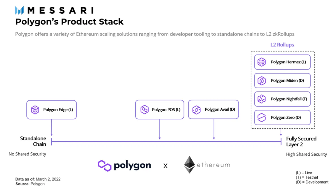 Polygon 的产品线包括 PoS 侧链和 6 个 zk 项目。其中 3 个——Hermez、Miden 和 Zero 是 ZK Rollup,另一个 Nightfall 是混合 Optimistic-zk rollup,而其余 2 个 Avail 和 Edge 是旨在帮助构建 zk 和模块化基础设施。