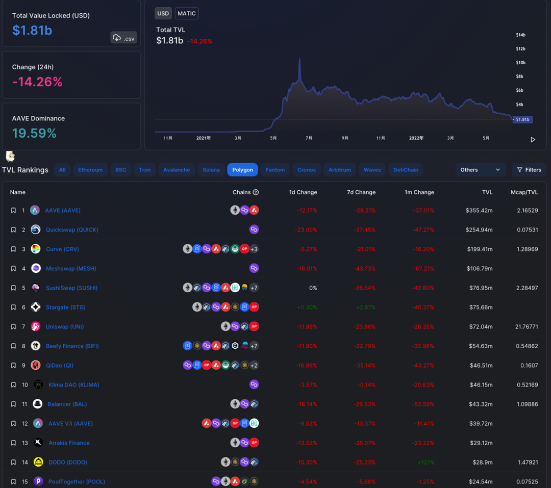 Polygon 生态目前总锁仓量为 18.1 亿美元,其中 AAVE、Quickswap、Curve、Meshswap 四个项目锁仓量达 1 亿美元以上。按照 DeFiLllama 统计的 249 个协议来看,其中半数以上是 DeFi 项目。