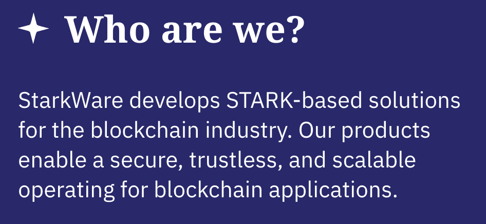 StarkWare 是 zk rollups 赛道内最好的公司之一,由前面提到的以色列理工学院的 Eli Ben-Sasson 教授(zk SNARK & zk STARK 的联合发明者)联合创立,它为区块链行业提供基于 STARK 技术的解决方案。