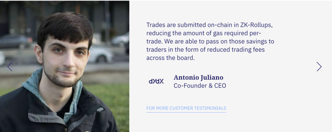 dYdX CEO Antonio Juliano 透露,2020 年中,去中心化交易所 dYdX 的 gas fee 高达收入的 90-100%,于是选择 StarkEx 扩展引擎,于 2020 年底,dYdX 推出 zk Rollup 版,每天处理数十亿美元的交易,将 gas 费降至原来的 1/50,促进业务增长了 500 倍。
