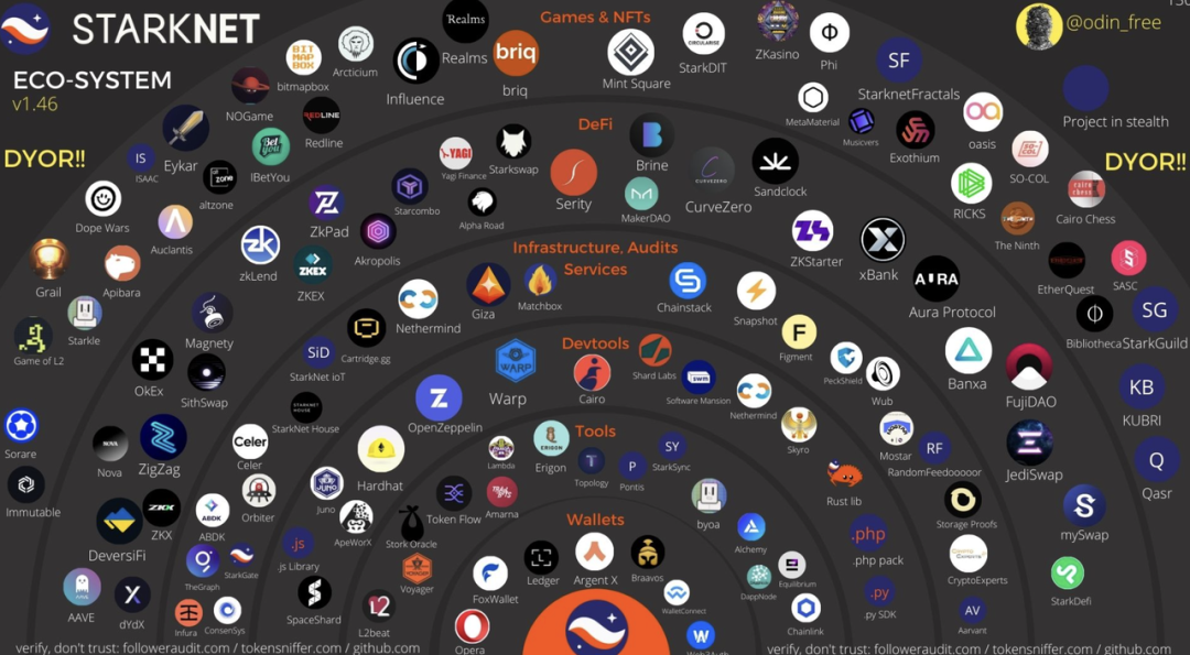 以太坊本身并非一个完美的设计,存在许多对开发者生产力的限制,因而适应以太坊标准的原生语言 Solidity 也存在依赖的数据结构低效等问题。StarkWare 使用的 Cairo 语言摆脱了以太坊的历史包袱,有望实现如今以太坊还无法做到的事情,比如和 AI 的结合,比如需要更高计算能力支持的游戏。其他声称 EVM 兼容、EVM 等效的 Layer2 在这一点上未必更有优势,以太坊的天花板就是他们的天花板。因此,StarkNet 上还出现了和以太坊或其他 Layer2 完全不同的生态:
