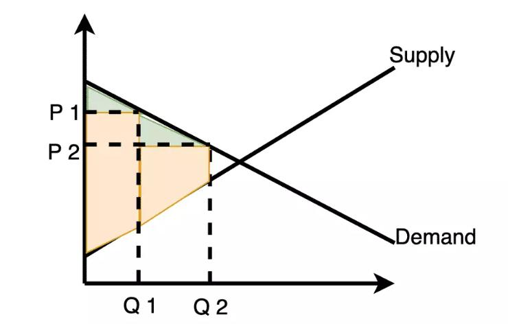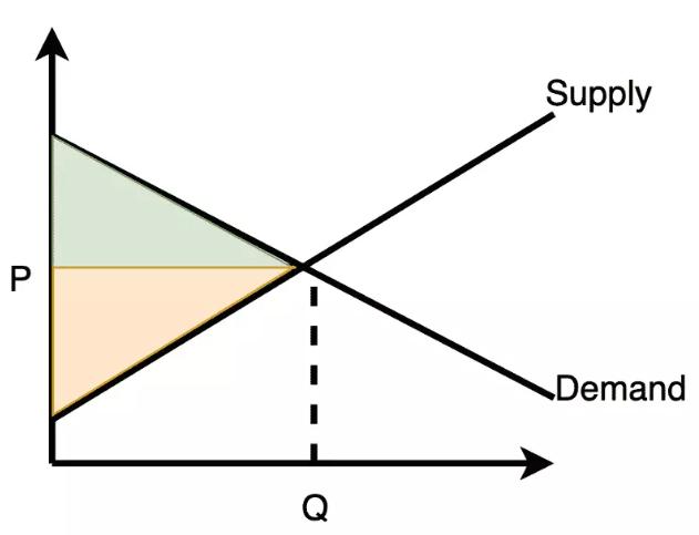 示例:下图中的橙色区域是向所有客户收取相同价格 (P) 时的生产者剩余: