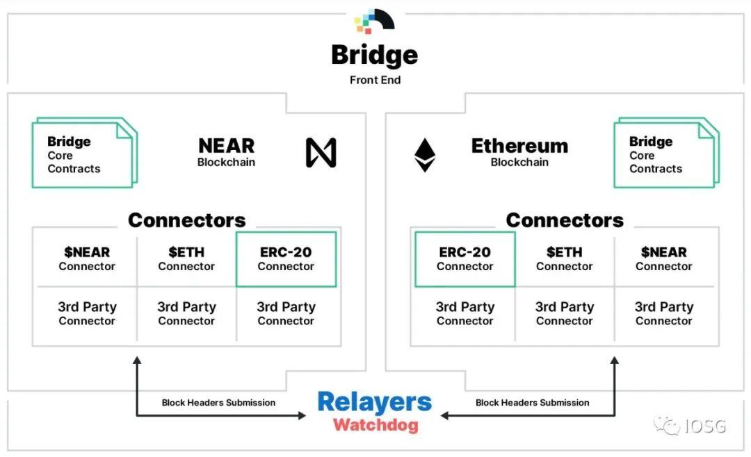 除此之外,NEAR的RainbowBridge也是典型的轻客户端模型。轻客户端作为智能合约,分别部署在以太坊(存储NEAR的区块头)和NEAR(存储以太坊的区块头)上。这些区块头由Relayer进行定期更新,更新频率取决于经济效率上的权衡——在以太坊上更新NEAR的区块头设置为12至16小时。Connector则负责处理特定资产的跨链逻辑(如ERC-20代币或NFT)。