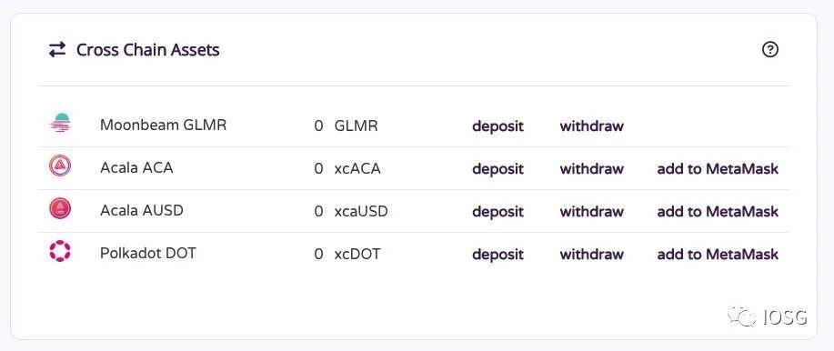 例如,Acala上的$ACA和$aUSD可以跨链到Moonbeam,作为XC-20资产($xcACA和$xcaUSD)实现与以太坊生态的互联互通。Moonbeam的原生代币$GLMR亦可在Acala上作为抵押品来铸造$aUSD或者参与质押。