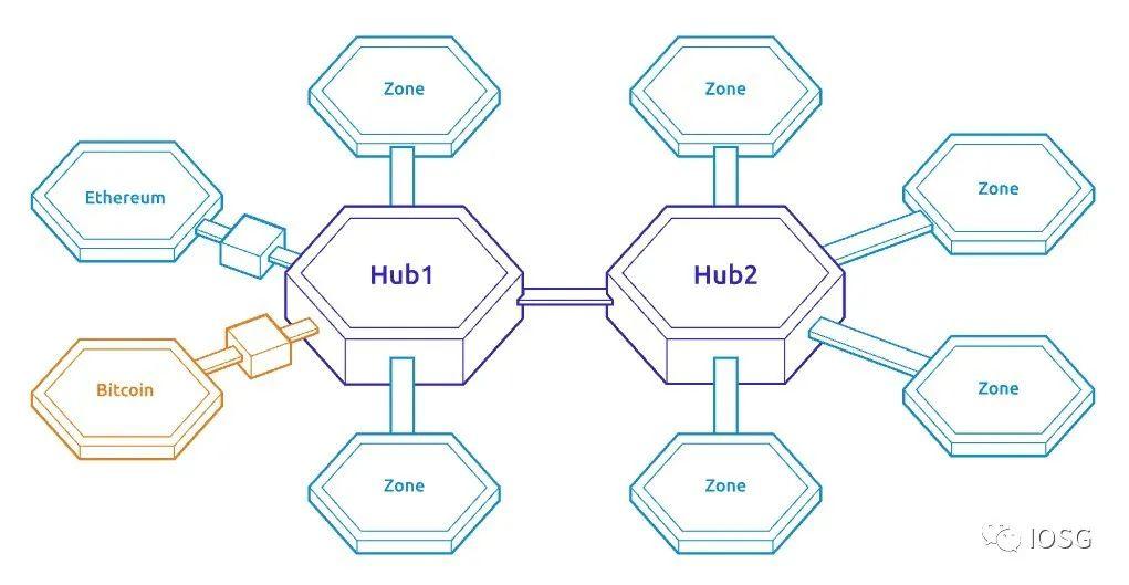 Cosmos包含两种类型的区块链:Zones和Hubs。Zones是常规的异构链,Hubs则用于把这些Zones连接起来。Zone和Hubs之间的通信和消息传递依赖于IBC(Inter-blockchain Communication)协议。当任意Zone与一个Hub建立IBC连接时,它可以与连接到该Hub的其他Zones进行通信。