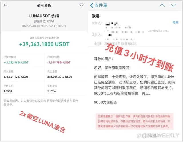 5月12日,他又发现币安和欧意两个交易所的Luna价格存在溢价,大约有十倍利润,便果断冲入币安购买Luna后提币到欧意交易所,希望挣这十倍的差价。可是链上的充值已经到位了,交易所的账户里却迟迟不显示充值到账。他在找朋友帮忙后苦苦等到了三个小时,才充值到交易所账户,但此时溢价已经消失。