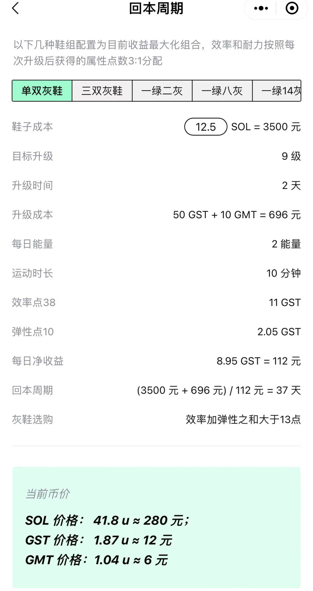 按照StepN模拟器的计算,SOL代币购买的鞋子回本周期最短的大约在37天。小孙认为,由于官方设定7月15日才清退,现在入场的国内用户回本也许还有望,“但之前成本高的人要赔钱了”。