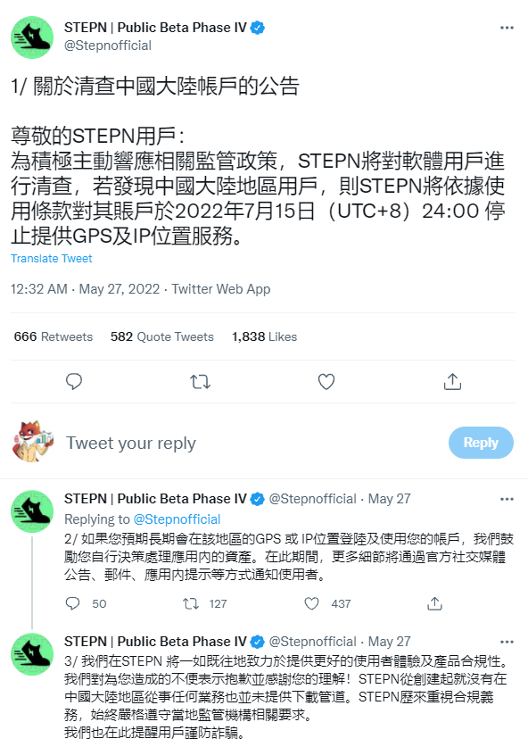 据公告内容显示,为积极主动响应相关监管政策,StepN将清查中国大陆帐户,若发现中国大陆地区用户,StepN将依据使用条款对其账户于2022年7月15日(UTC+8)24:00停止提供GPS及IP位置服务。如果用户预期长期会在该地区的GPS或IP位置登陆及使用帐户,官方鼓励用户自行决策处理应用内的资产。在此期间,更多细节将通过官方社交媒体公告、邮件、应用内提示等方式通知使用者。