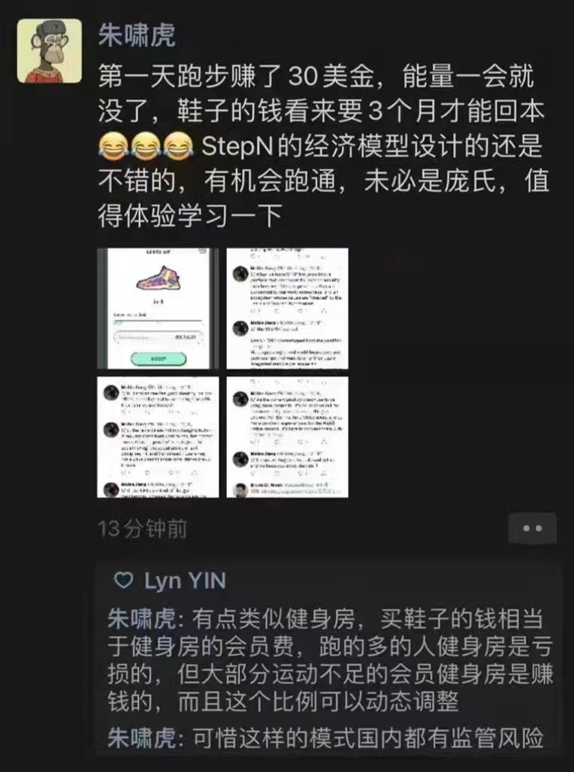 朱啸虎也在朋友圈称他购买NFT鞋子的这几万块花得挺值,并称赞了StepN的经济模型设计,觉得“未必是庞氏”,有机会跑通,“值得体验学习一下”。但很快,他又在这条状态下面补充了一条评论,“可惜这样的模式在国内都有监管风险”。
