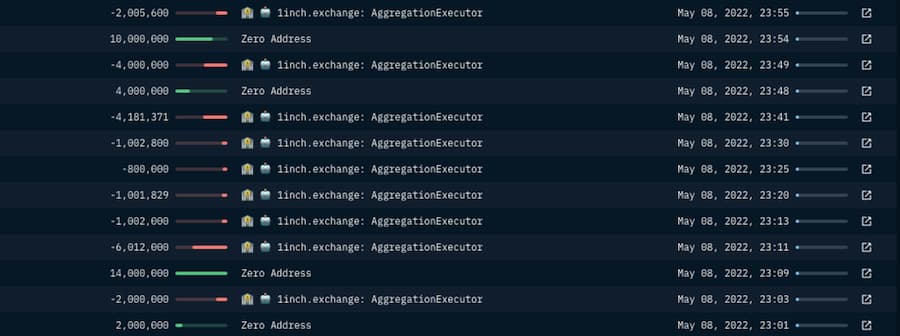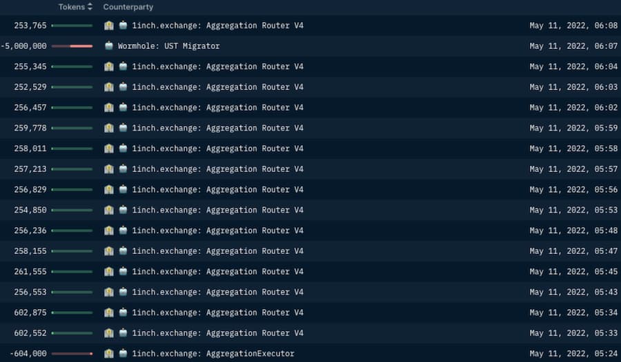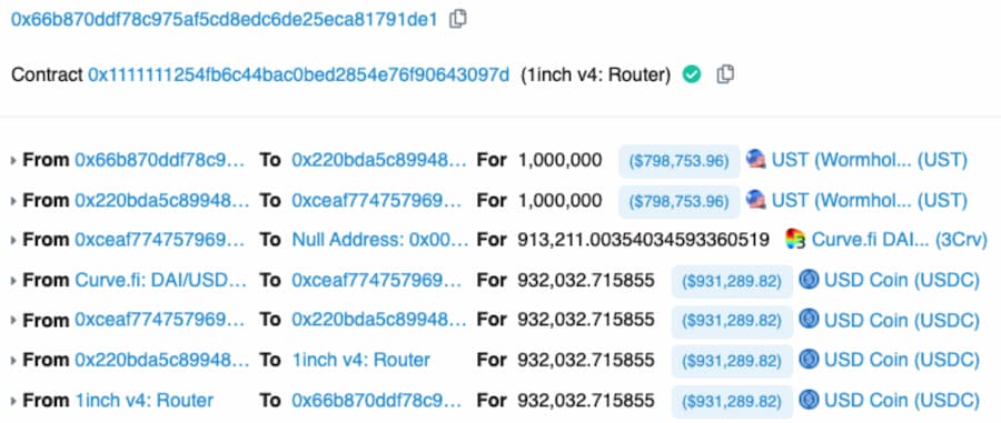 这个钱包从 2021 年 12 月开始进行了超过 62 笔交易。从 4 月初到 5 月 8 日,这个钱包将价值超过 7900 万的 UST 桥接到以太坊,然后通过 1inch aggregator 的几笔交易主要换成了 USDC。