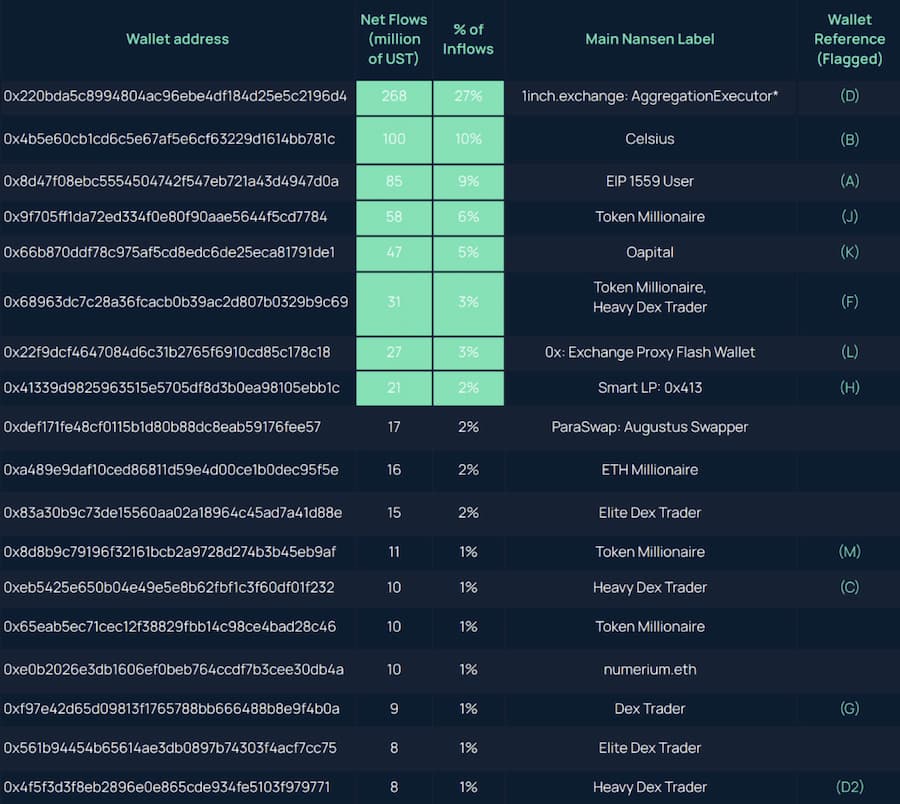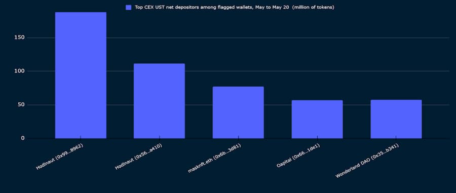 图 15:向中心化交易所发送 UST 的顶级钱包 + 早期 Curve 交换者 + Wonderland(5 月 1 日至 5 月 10 日)