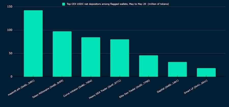 图 16:向中心化交易所发送 USDC 的顶级钱包 + 早期 Curve 交换者(5 月 1 日至 5 月 10 日)。