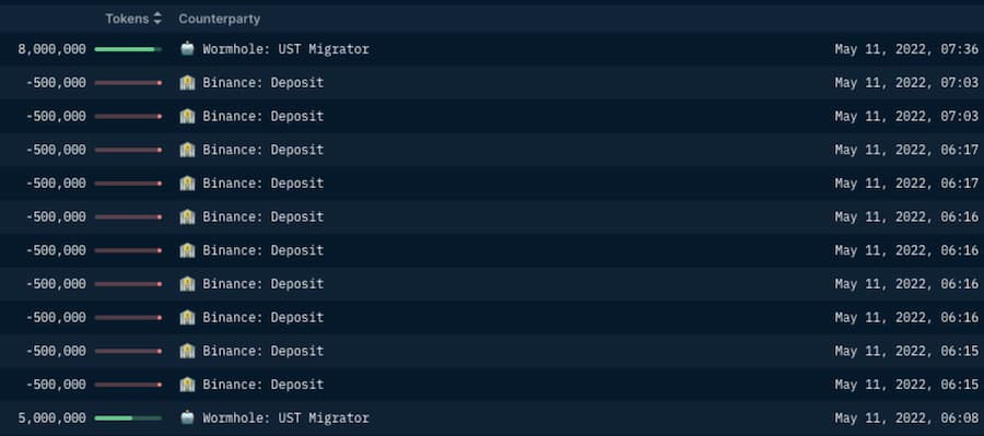 上表显示,仅 Oapital 就对 Binance 和 FTX 产生了巨大的抛售压力,大部分的卸载活动都是在 Binance 进行的。遗憾的是,我们无法匹配从 WormholeUST 迁移者合约地址收到的 UST 的来源。