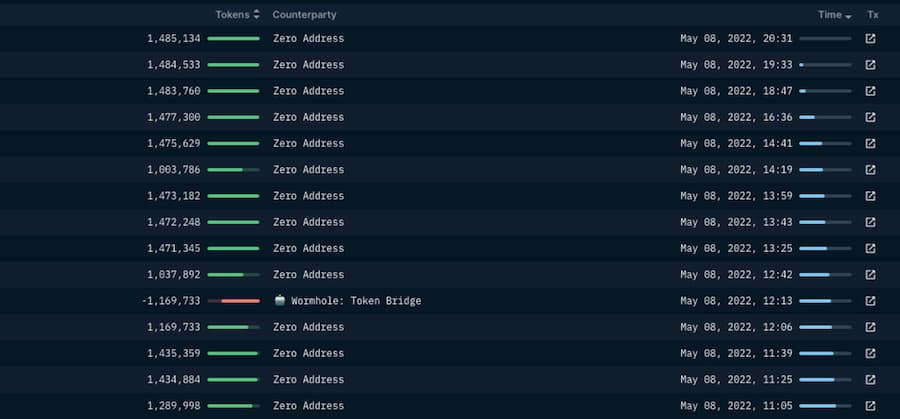 同样,这个钱包通过 Wormhole 收到了很多交易,有的早在 1 月份就收到了。5 月 8 日,它在一次 1-1.5M 的 UST 交易中,将价值刚过 2000 万的 UST 桥接到以太坊。这相当于在此期间总流出量的 1.6%。