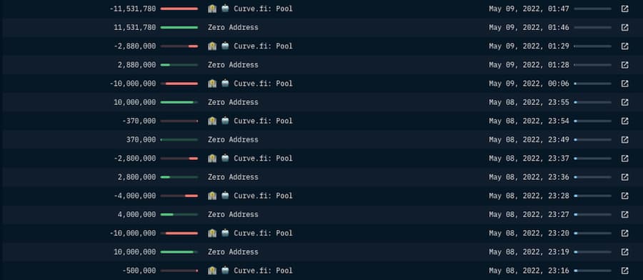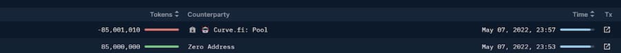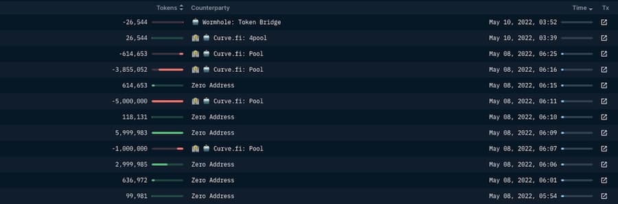 所有的交易记录大多与 UST 和 USDC 有关,并在 5 月 9 日停止。最值得注意的交易是在 5 月 7 日将价值超过 8500 万的 UST 与以太坊连接起来。这些代币随后被发送到 Curve,并被换成了大约 8450 万的 USDC。