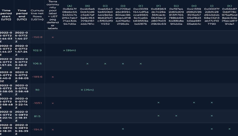 第三阶段的分析涉及到对这些综合链上证据的三角分析,这使我们能够将相关活动拼凑在一起,并制定一个解释 UST 脱锚的叙述。我们还确定了七个最有可能在 UST 脱锚事件中发挥重要作用的钱包名单: