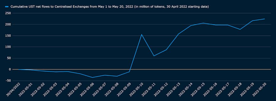 从 5 月 1 日到 5 月 20 日,所有被 Nansen 标记的中心化交易所的账户都收到了大约 2.25 亿个代币的净流入,包括 Wormhole-UST 和 wrapped-UST。我们在本节中用 「UST」来指代汇总的 Wormhole 和 wrapped 的代币。