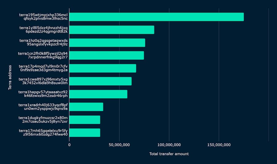 在分析 5 月 5 日至 5 月 8 日的交易时,我们发现在此期间有 984 个独特的 Terra 钱包地址活跃。大部分的交易量集中在几个钱包里。例如,前 10 个钱包地址的交易量占该时间段内转移的 UST 总量的 57% 以上。
