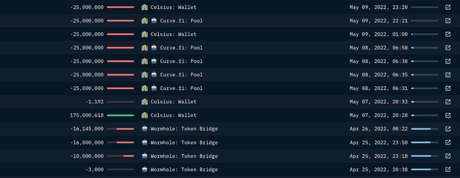 这个钱包从 2022 年 4 月下旬开始活跃。在 4 月 21 日至 25 日期间,它将约 1.38 亿 UST 代币桥接到 Terra。值得注意的是,该钱包在 5 月 7 日将 1.75 亿 UST 从 Terra 桥接到以太坊。从相应 Terra 地址接收资金的钱包是 0xf642ea51c645c48196d9831a5937e95b0e9b4f7f。然后它在同一天将资金发送到另一个地址(交易)。在这个钱包的资金中,有 1.25 亿被分批换成了 Curve 上的 USDC,数量为 2500 万。根据 Nansen 的数据,Celsius 是一个密切的交易方,曾向这个钱包发送和接收资金。