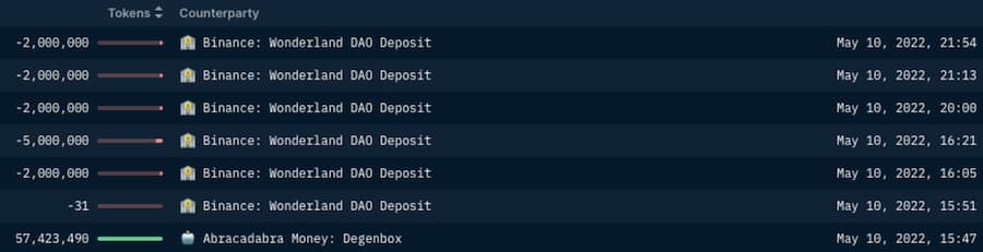 除了上述可疑地址,我们还注意到 Wonderland DAO 在 5 月 10 日和 11 日之间向 Binance 发送了 5740 万 UST,在清算了他们的 Abracadabra Degenbox 之后。