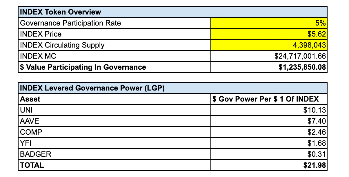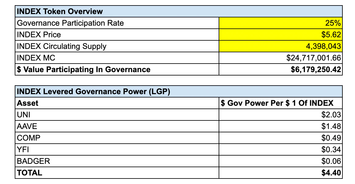 现在,让我们计算一下每 1 美元的 INDEX 参与治理的最大潜在杠杆治理能力。