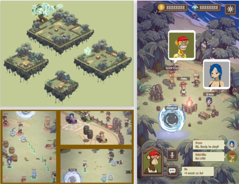 这种思路下的项目则是具体游戏的呈现了,通过提供一个完整的游戏世界,让玩家能将自己的NFT资产导入进游戏作为角色使用,巧妙的借助了NFT项目方所构建出来的社区网络,同时也能让项目方巩固并活跃自己社区内的氛围,对于玩家而言,不仅增加NFT的使用价值,也延展了其社交场景。