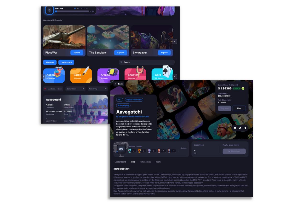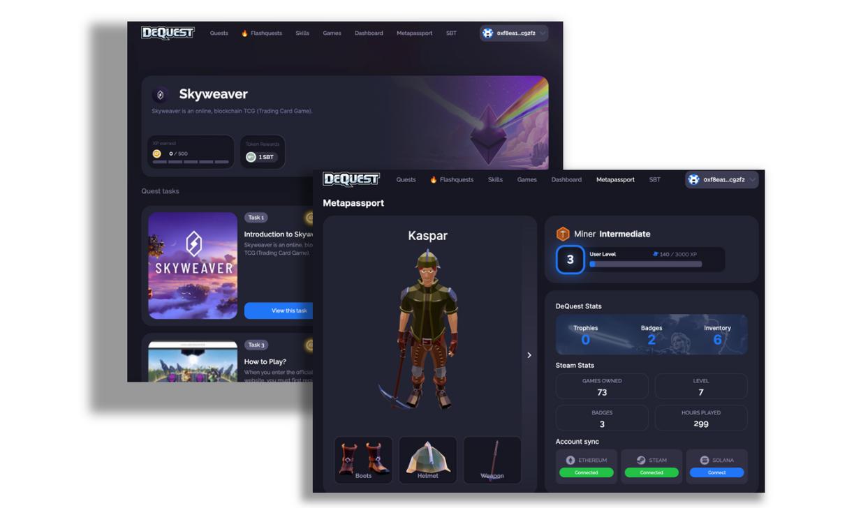 DeQuest是一个从Quest系统切入的GameID平台,其做了非常有意思的游戏化设计,使用户的GameID以虚拟形象的形态呈现(未来可使用该形象进入sandbox),在完成任务的过程中可以解锁装备和技能。