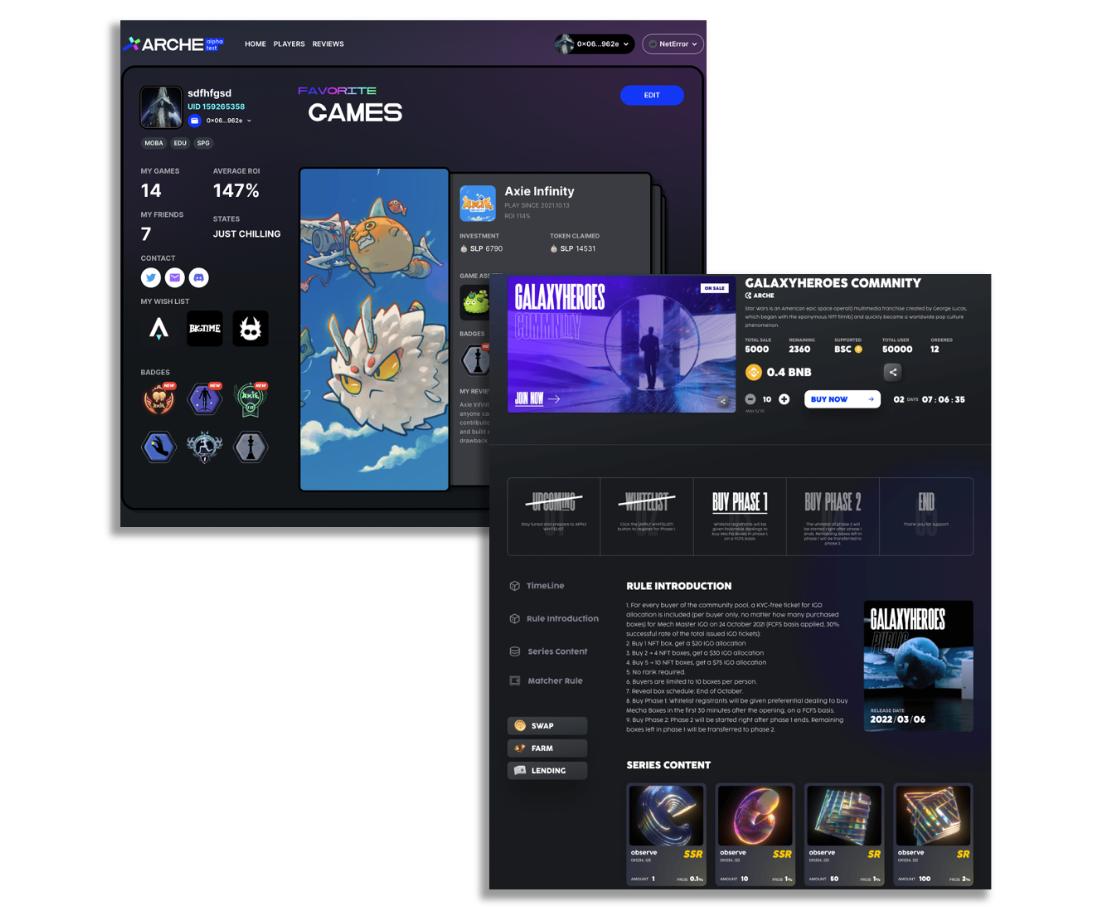 如果说前两个项目是比较典型侧重与用户方的,Arche则会偏向于B端的项目方和公会。由于目前并没有可用的Demo,因此最终的产品形态仍需等官方透露消息。但通过官网的信息可以了解到,其拥有能帮助游戏项目方快速开商城的sdk,类似于steam的游戏上架模式,玩家可以该游戏方的商城内购买和交易该游戏的资产。
