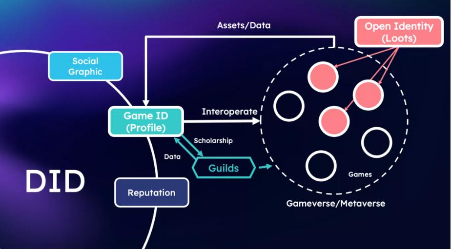 而想要做到这一点,就需要玩家拥有一个通用的身份格式,即游戏版的DID,其记录着玩家在各个游戏中的经历、声誉、资产和成就,同时由于去中心化身份的通用性,该身份所关联的社交关系也可以自由的带入到不同的游戏中,这里我们将这种DID称为GameID,其与其他的身份数据构成了用户完整的DID形象。
