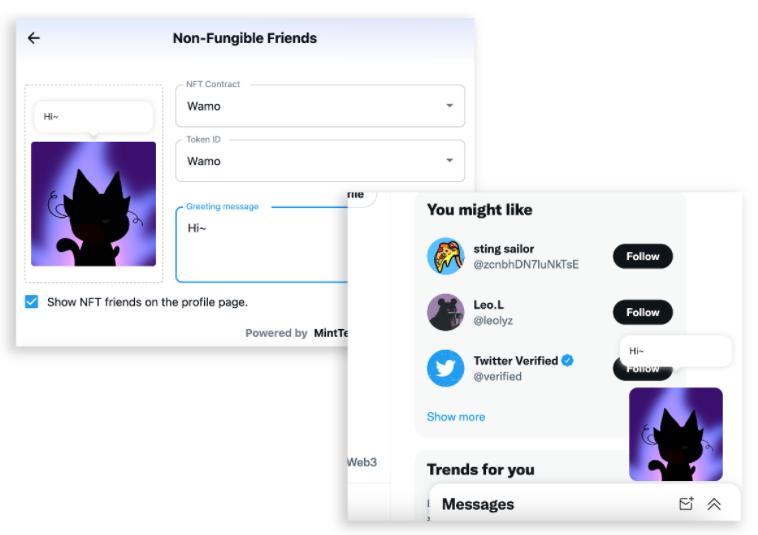 Non-Fungible Friend是Mask插件中另外一个组件,目前功能相对简单,但其思路和方向却是比较有意思,其延伸了NFT头像的概念,用户能将NFT单独部署到自己的Twitter个人主页中,作为一个接待员的存在,类似于早年的桌面助手。