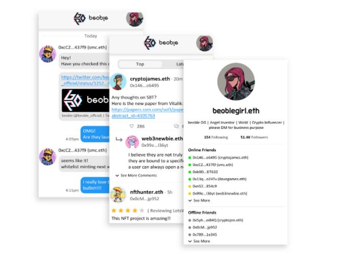 不同于Swapchat主打跨平台的应用功能,Beoble则是将社交功能做成了API和SDK,让任何项目方能轻易快速的接入并完善自己的社交场景。其提供了包括个人Profile、Feed流、即时私聊在内的模块化功能,对于想要做自己社交生态的游戏方/项目方而言会是个十分趁手的工具。
